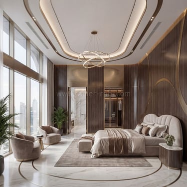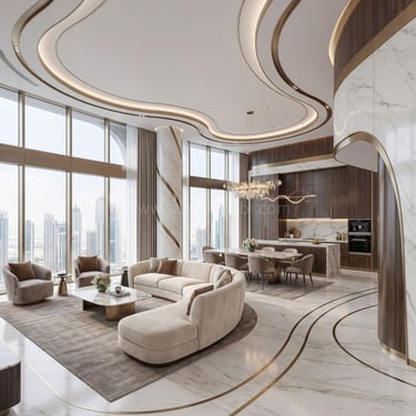 The interiors echo the fluidity of the exterior form. Curved ceiling details with integrated lighting lines flow seamlessly into marble flooring inlays, creating a sense of movement throughout the space.