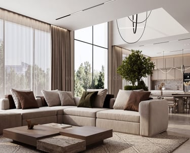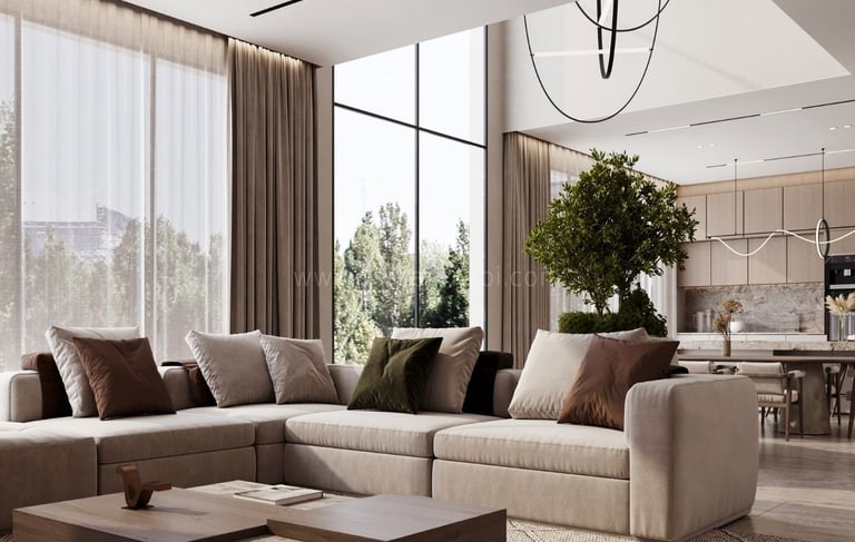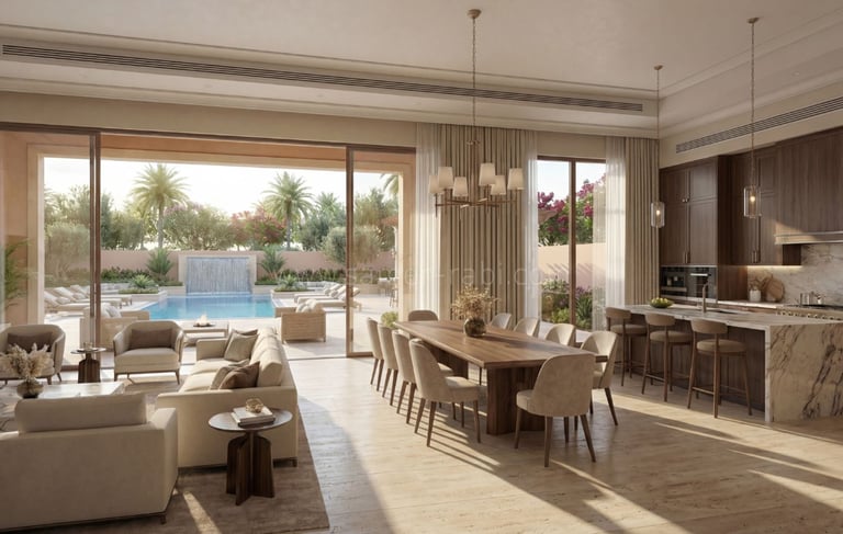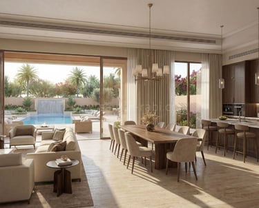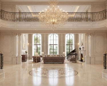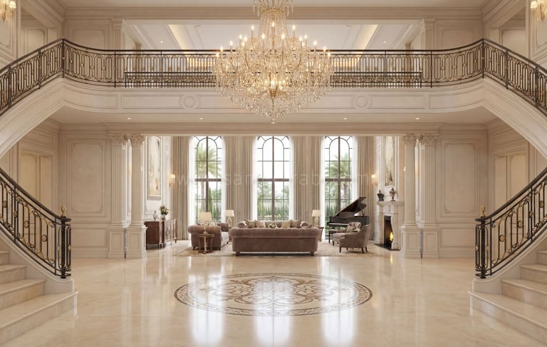 The exterior of this prestigious villa is inspired by Luxury European Neo-Classical architecture, showcasing a composition defined by harmonious symmetry, majestic Corinthian columns, finely detailed cornices, and a refined mansard roof.