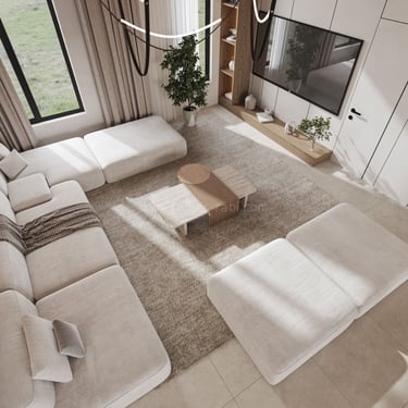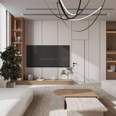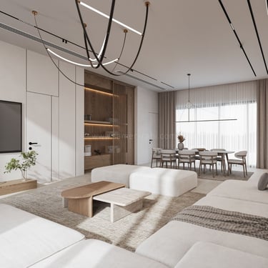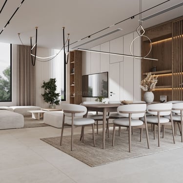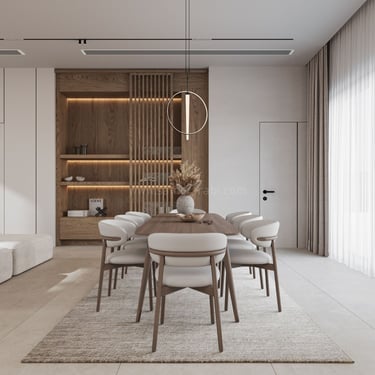 A contemporary open-plan living and dining space defined by warm wood accents, soft neutral furnishings, and clean architectural wall panels. Sculptural pendant lighting, integrated shelving with ambient lighting, and large windows create a bright and elegant interior with a calm, minimalist character.