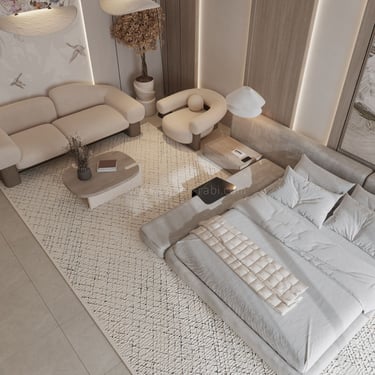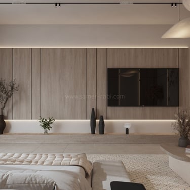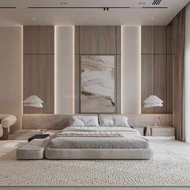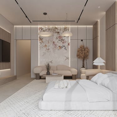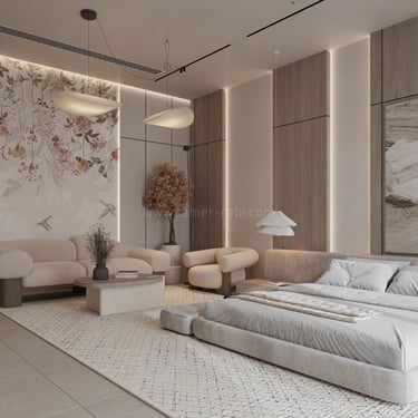 A serene bedroom interior defined by warm wood wall panels, soft neutral furnishings, and integrated ambient lighting. A decorative floral feature wall behind the lounge seating, sculptural pendant lights, and minimalist furniture create a calm and elegant contemporary atmosphere.