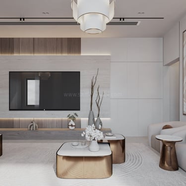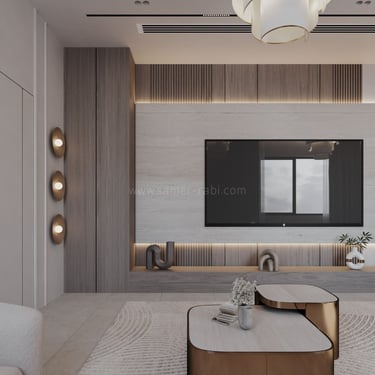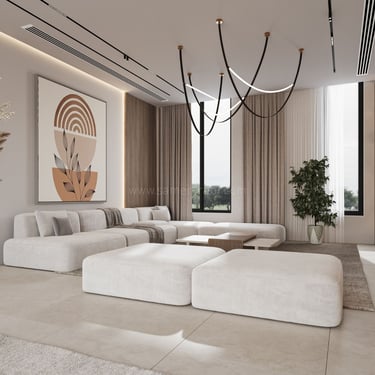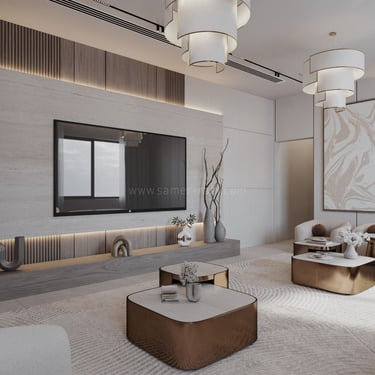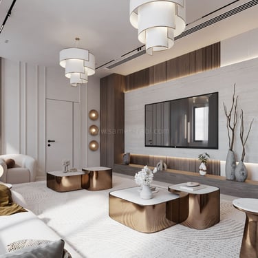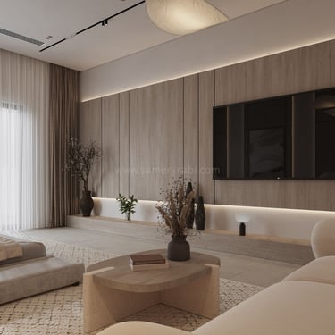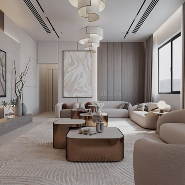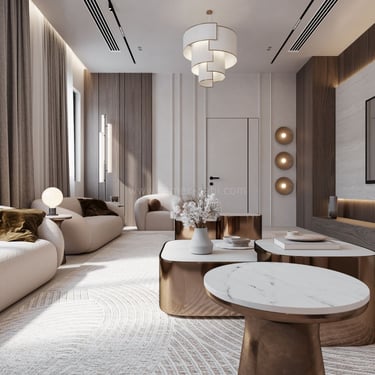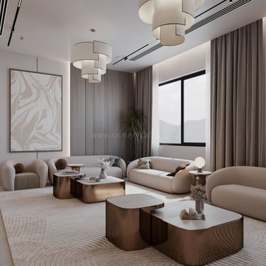 A sophisticated majlis space defined by soft neutral tones, curved upholstered seating, and sculptural lighting. Warm wood wall panels, bronze-accented coffee tables, and integrated ambient lighting create a refined contemporary atmosphere that balances comfort with understated luxury.